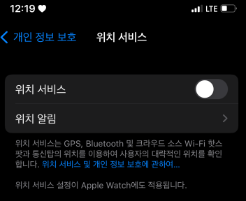 [설정] - [개인 정보 보호] - [위치 서비스] - 위치 서비스 OFF