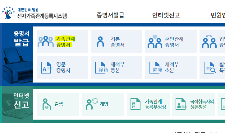 위 형광펜으로 표시된 '가족관계 증명서'로 들어가 주세요.
